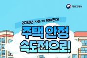 2026년 사는 게 편해진다! 주택 안정 속도전으로! ■ 수도권 공급 속도 UP! 2026년, 공급체감도를 획기적으로 높입니다. · 공공택지 착공 확대 수도권 공공택지에서 5만 호 이상 착공 목표 · 3기 신도시 최초 입주 인천계양을 시작으로 3기 신도시 입주가 최초로 시작 · 유휴공간 활용 노후청사, 학교용지 등 유휴공간 복합개발 착공 (~'30년까지 3.5만 호+) ■ 도심 공급 혁신 30년까지 공급 물량 UP! · 도심복합사업 활성화 - 5만 호 착공 목표(~'30년) - 용적률 상향(최대 법적상한 140%) - 일몰제 폐지로 사업 속도 제고 · 민간 정비 촉진 사업 절차 간소화 및 갈등 관리 강화로 최대 3년 단축 효과 ■ 공적 주택 110만 호 이상 공급 임대주택 혁신으로 주거 기본권 보장! · 공급 목표 임기 내 공적 주택 110만 호 이상 공급 · 2026년 공적임대 15.2만 호 공급 목표 · 재고율 목표 OECD 평균(7.1%)을 넘어 10% 달성 목표 ■ 나에게 딱 맞는 지원 생애주