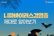 ■ 제1급 감염병 '니파바이러스감염증'이란? 니파바이러스(Nipah virus) 감염에 의해 사람과 동물 모두 감염될 수 있는 인수공통감염병입니다. 인체 감염시 40~75%의 높은 치명률을 보이나, 백신과 치료제가 없어 감염되지 않도록 주의해야 합니다. ■ 니파바이러스감염증 어떻게 감염되나요? - 감염된 동물과 직접 접촉 - 오염된 식품 섭취(대추야자수액 등) - 환자의 체액 접촉(비말, 소변 등) 자연숙주인 과일박쥐(fruit bat) 서식지 중심으로 산발적으로 발생하며, 니파바이러스에 감염된 동물과 접촉한 사람이나 오염된 식품을 먹은 가축, 환자의 체액에 직접 노출된 사람에게 전파될 수 있습니다. ■ 니파바이러스감염증 어디서 발생하나요? - 인도: 2001~2024년, 환자 104명 발생(76명 사망, 치명률 73%) - 방글라데시: 2001~2024년, 환자 343명 발생(245명 사망, 치명률 71%) 최근 인도, 방글라데시에서 지속 발생, 해당 국가 여행 시 감염 예방수칙을 준수하여 주시기 바랍니다. ■ 니파바이러스감염증 주요 증상은? 초기에 발열, 두통, 인후통, 근육통 등