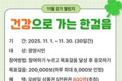 광양시는 지역 주민의 건강생활 실천을 돕기 위해 11월 1일부터 30일까지 모바일 걷기 앱 '워크온'에서 ‘건강으로 가는 한걸음 11월 걷기 챌린지’를 운영한다고 밝혔다. 이번 걷기 챌린지는 1걸음당 1마일리지가 적립되며, 1일 최대 8천 마일리지가 누적된다. 기간 중 20만 보를 달성하면 20만 마일리지가 쌓여 모바일상품권(5천 원권) 응모가 가능하다. 시는 목표 걸음을 달성한 참여자 중 추첨을 통해 800명에게 상품권을 지급할 예정이다. 참여를 희망하는 시민은 모바일 걷기 앱 ‘워크온’을 설치하고 ‘광양시 공식 커뮤니티’에 가입한 뒤, 챌린지 탭에서 광양시 걷기 챌린지 참여하기를 누르고 목표 마일리지가 쌓일 때까지 스마트폰을 소지하고 걸으면 된다. 광양 지역 제한이 설정되어 있어 참여 시 휴대폰 위치 설정을 반드시 켜야 하며, 자세한 사항은 광양시보건소로 문의하면 된다. 반미순 건강증진과장은 “걷기는 체력 증진은 물론 스트레스 해소에도 큰 도움이 된다”며 “걷기 좋은 계절인 가을, 시민 여러분의 많은 참여를 바란다”고 말했다. 한편, 광양시는 생활 속 움직임