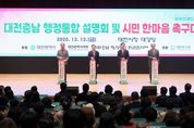 대전시는 12일 시청 대강당에서 대전광역시의회, 대전충남 행정통합 민관협의체(이하 민관협)와 공동으로 “대전충남 행정통합 설명회 및 시민 한마음 촉구대회”를 개최하고, 대전충남 행정통합 특별법안의 조속한 국회 심의․의결을 촉구했다. 이날 행사는 최근 대통령이 행정통합의 필요성을 공식 언급하면서 통합 논의가 새로운 전기를 맞은 가운데 마련됐으며, 약 600명의 시민이 참석해 추진상황을 공유하고 통합 의지를 결집했다. 이창기 민관협 공동위원장은 지난 10월 2일 특별법안 발의 이후 경과를 소개하며, 통합으로 기대되는 효과를 설명했다. 이 공동위원장은 통합 시 인구 360만 규모의 초광역 혁신 클러스터 형성, 광역교통․생활권 확장 등 실질적인 변화를 강조하며 “행정통합은 수도권 일극체제에 대응할 충청권의 경쟁력 확보 전략”이라고 밝혔다. 설명회 후에는 통합을 촉구하는 퍼포먼스가 진행됐다. 이장우 대전시장, 조원휘 대전시의회의장, 이창기 민관협 공동위원장, 남재동 대전사랑시민협의회장이 관객석에서 행정통합을 촉구하는 구호를 선창하고 시민이 후창하는 카드섹션을 펼쳤으며, 이어 무대에서는 통합 결의를 상징하는
