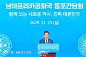 주요 20개국(G20) 정상회의 참석을 위해 남아프리카공화국을 방문한 이재명 대통령은 23일(현지시간) 양국 수교 후 최초로 동포간담회를 개최해 현지에 거주하는 동포들을 격려했다. 이번 간담회에는 동포단체 대표, 경제인, 민주평통 자문위원, 한글학교 관계자, 문화예술인 등 약 70명이 참석했다. 동포 대표로 나선 전소영 남아공 한인회장은 환영사에서 "한국과 남아공은 오랜 세월 우정과 신뢰를 쌓아온 파트너인 만큼, 대통령님의 이번 방문이 양국 관계를 굳건히 다지는 계기가 되기를 기대한다"는 소망을 전했다. 이 대통령은 격려사를 통해 "모국에서 약 1만 2000km인 삼만 리나 떨어진 남아공에서도 동포들이 주권 행사에 어려움이 없도록 전자투표 도입 등 재외선거제도 개선에 노력하겠다"라고 말했다. 또한, "재외동포 현황을 면밀히 파악하고 동포들의 활동을 본국이 적극 지원해 대한민국 국민으로서 소외되지 않고 자부심을 가질 수 있도록 최선을 다하겠다"고 격려했다. 이어 이동민 민주평통자문회의 아프리카협의회 중남부지회장의 건배사로 본격적인 오찬이 시작됐다. 이 대통령은 동포들의 다양한 목소리