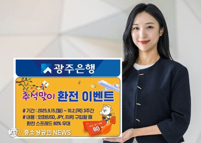 광주은행은 15일, 추석 명절을 맞아 외국통화 환전 시(외국통화 사실 때) 최대 80% 환율 우대를 제공하는 ‘추석맞이 환전 이벤트’를 실시한다고 밝혔다.