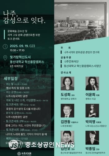 한편, ‘나주시 문화․관광 콘텐츠 연구회’에는 주최하는 토크콘서트는 당초 7월 19일 예정됐으나, 집중호우로 인한 지역 피해와 안전 우려로 한 차례 연기된 바 있다.