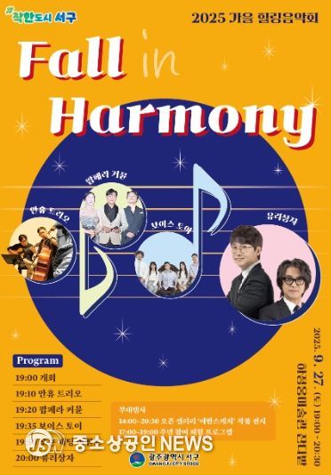 광주광역시 서구는 오는 27일 오후 7시 농성동 하정웅미술관 앞 잔디광장에서 ‘2025 가을 힐링음악회 – 폴 인 하모니(Fall in Harmony)’를 개최한다.