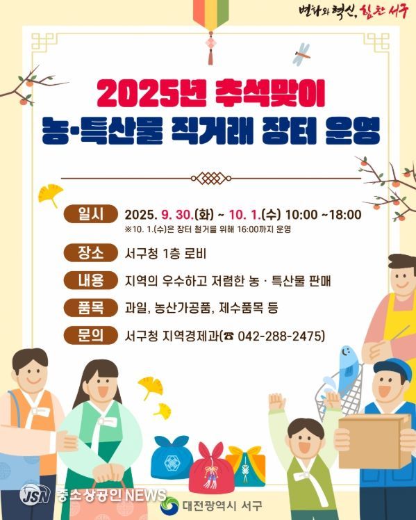 대전 서구는 이달 30일부터 다음 달 1일까지 이틀간 서구청 1층 로비에서 추석 맞이 농·특산물 직거래 장터를 운영한다.