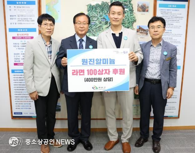 ㈜원진알미늄이 완주군에 라면 100상자(환가액 400만 원 상당)를 전달했다.