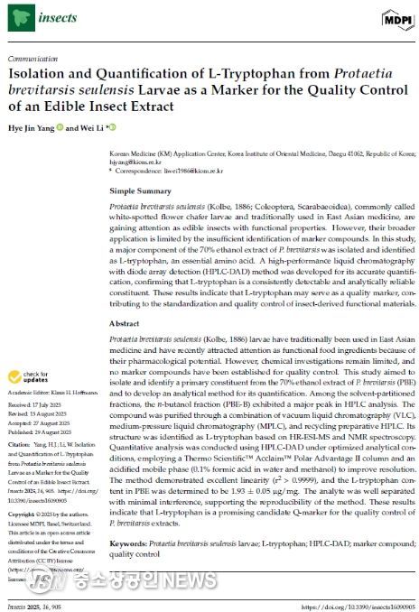 농촌진흥청은 이번 연구로 꽃벵이 추출물의 뼈 건강 개선 지표성분이 L-트립토판임을 밝히고 국제학술지 Insects(IF 2.9)에 논문으로 게재했다. 이로써 꽃벵이를 활용한 기능성 소재 표준화와 품질관리 체계 확립의 과학적 근거를 마련했다.