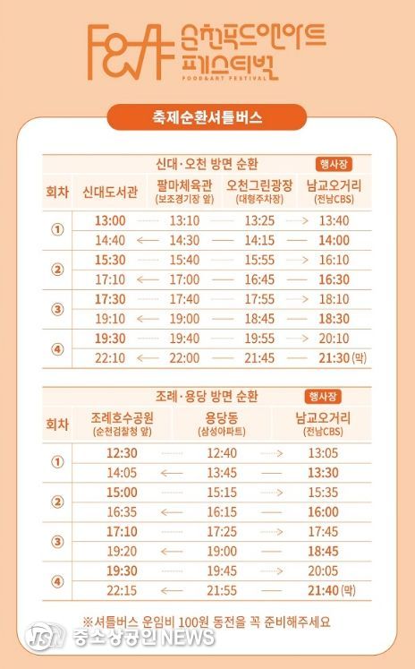 셔틀버스의 승하차 장소는 남교오거리이며, 운행 노선과 시간표 및 이벤트 내용은 순천푸드앤아트페스티벌 홈페이지와 순천 관광 공식 SNS를 통해 안내될 예정이다.