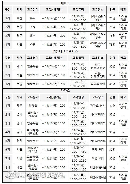 국내의 대표적인 인공지능(AI) 기업인 네이버, 뤼튼테크놀로지스, 카카오(이상 가나다 순)가 교육기관으로 참여하며, 각 기관이 직접 기획한 교육과정(커리큘럼)에 따라 현장 교육과 온라인 교육이 함께 진행될 예정이다.