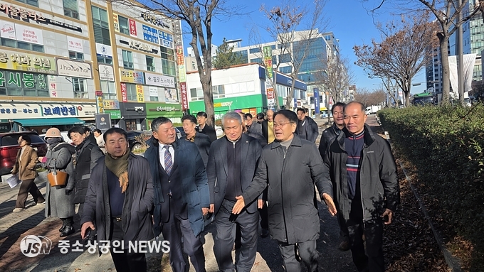 [강기정 광주광역시장이 22일 오전 시청 시민홀에서 열린 ‘광주도시철도 2호선 1단계 구간 도로개방 현장 확인’ 행사에서 시민들과 함께 도시철도 2호선 1공구 구간을 방문해 도로 개방 현황과 공사 진행 상황을 점검하고 있다.] (사진=중소상공인뉴스)