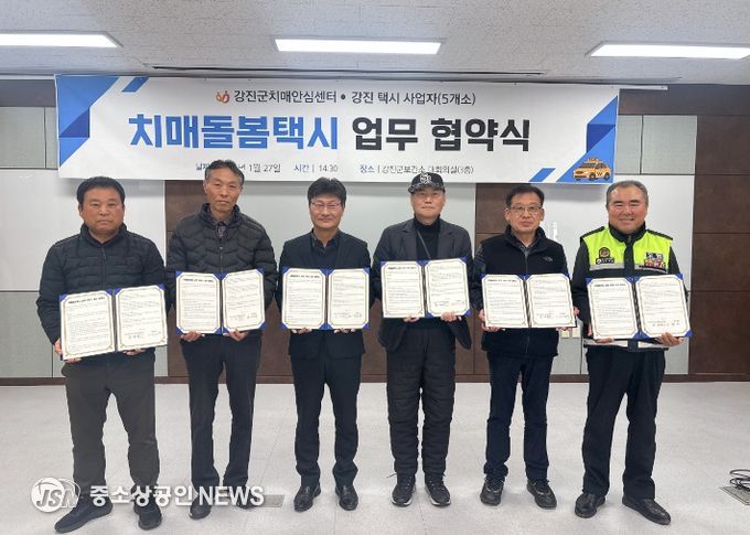 강진군보건소(강진군치매안심센터)가 지난 27일 치매환자와 이동이 불편한 주민들의 편의를 높이기 위해 관내 개인택시사업자 5명과‘ 치매돌봄택시’ 송영서비스 업무협약을 체결했다