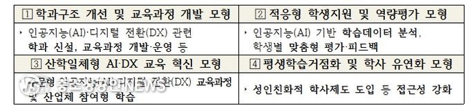 교육부는 2026년 신규 사업 공모를 통해 총 24개 내외 사업단(전문대학)을 선정하여 사업단별 최대 10억 원(총 240억 원)을 지원할 예정이다. 주요 추진 내용으로는 ▲인공지능(AI)·디지털 전환(DX) 환경 조성, ▲재학생·교직원·지역주민 맞춤형 인공지능(AI) 역량 강화, ▲대학별 특화모형 구축이 있다.