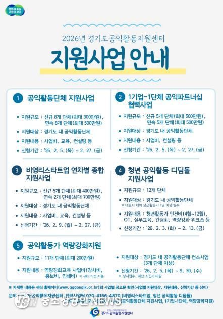 경기도공익활동지원센터가 ‘2026년 경기도 공익활동 지원사업’에 참여할 도내 공익활동 단체를 모집한다.