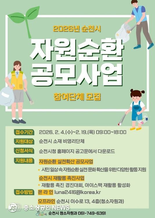 순천시는 시민의 일상 속 자원순환 문화 확산과 재활용 실천 활성화를 위해 2026년 자원순환 공모사업 참여 단체를 모집한다고 밝혔다.