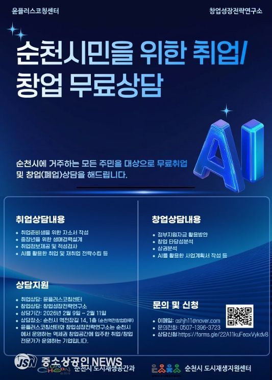 순천시는 순천역전 창업마루(도시재생 거점시설)에 입주한 창업컨설팅 전문기업 주관으로 ‘취업·창업 무료상담’을 진행할 예정이다.