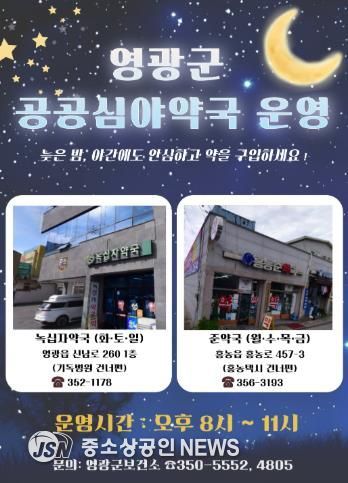 이번에 지정된 공공심야약국은 요일별로 운영되며, ▲녹십자약국은 화·토·일요일(영광읍 신남로 260 1층), ▲준약국은 월·수·목·금요일(홍농읍 홍농로 457-3)에 운영된다.