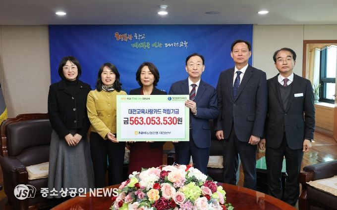 대전시교육청은 지난해 각급학교와 산하기관 및 교직원이 대전교육사랑카드를 사용하여 모은 적립금 5억 6,300만원을 2월 21일 NH농협은행 대전본부(본부장 황진선)로부터 전달받았다.