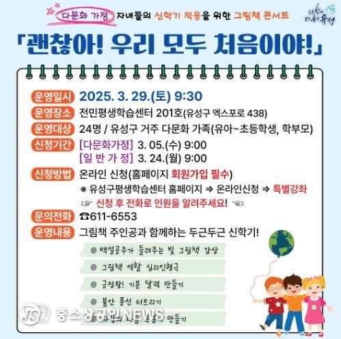 대전 유성구는 29일 전민평생학습센터에서 다문화 가정 자녀들을 대상으로 체험형 그림책 콘서트 ‘괜찮아! 우리 모두 처음이야’를 열고 수강생을 모집한다.