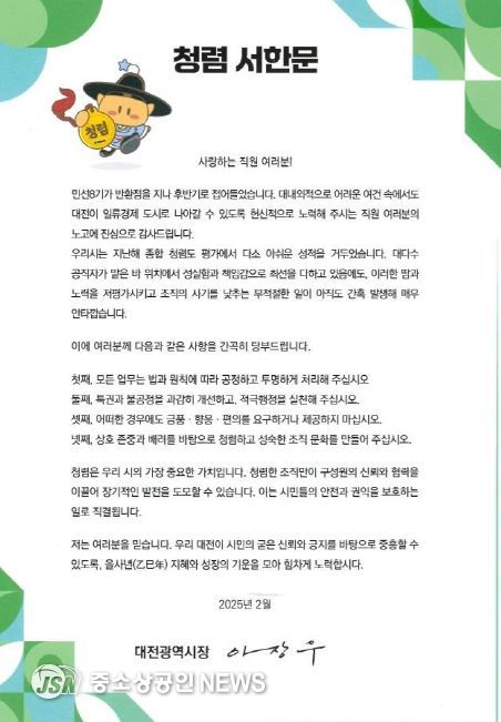 이장우 대전시장은“청렴은 공직자의 기본 책무이자, 시민 모두가 함께 실천해야 하는 가장 중요한 가치”라며, “이번 청렴 서한문을 계기로 공직자와 시민이 하나 돼 일류 청렴 도시 대전을 만들어 나가겠다”라고 말했다.