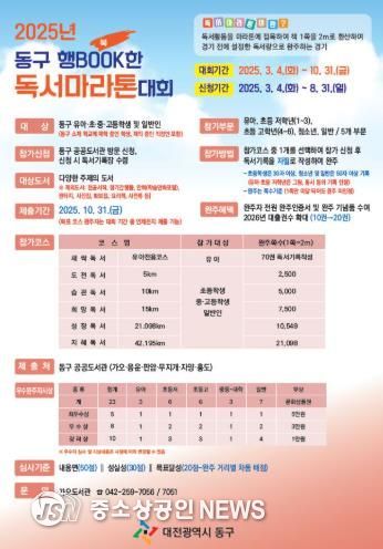 대전 동구는 구민들의 독서 생활화와 독서 문화 확산을 위해 3월부터 10월까지 ‘2025년 동구 행BOOK한 독서마라톤 대회’를 개최한다고 5일 밝혔다.