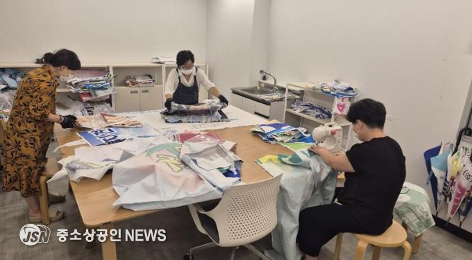 옥주골 창작소는 지난 6월에 진도군 옥외광고협회와 연계해 폐현수막을 수거했고, 7월에는 세척과 건조 등 전처리 과정을 거친 폐현수막을 활용하여 디자인 작업 후 대형 마대, 줍줍 주머니, 화폭(캔버스) 등을 제작했다.