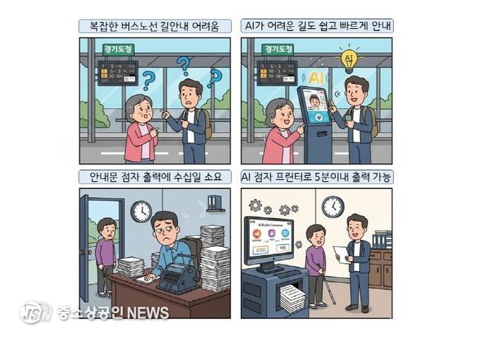 AI 키오스크가 실시간 교통 상황을 분석해 최적 경로와 환승 정보를 음성으로 안내하고, 수개월 걸리던 문서 분석-점자 번역-출력 과정을 단 5분 만에 가능하게 하는 AI 점자프린터 기술이 경기도에서 실증된다.