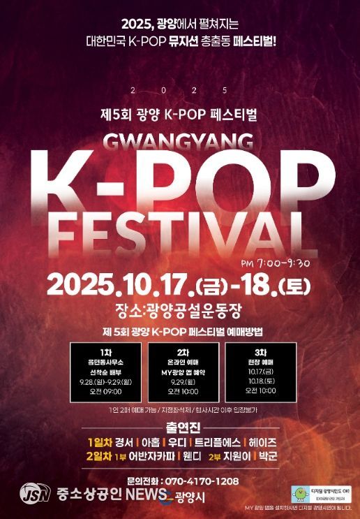 이현주 관광과장은 “오는 28일 티켓오픈을 시작으로 제5회 광양 K-POP 페스티벌에 대한 관심이 한층 뜨거워질 것으로 예상한다”며 “입장권 배부 일정과 달라진 예약 방식을 미리 숙지하면 원하는 좌석을 확보하는 데 도움이 될 것”이라고 말했다.