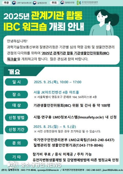 질병관리청은 유전자변형생물체 및 고위험병원체를 취급하는 기관의 자율적 생물안전 역량 강화를 위해 9월 25일 서울 JK아트컨벤션(서울 영등포구 소재)에서 '2025년 관계기관 합동 기관생물안전위원회 워크숍'을 개최한다고 밝혔다.
