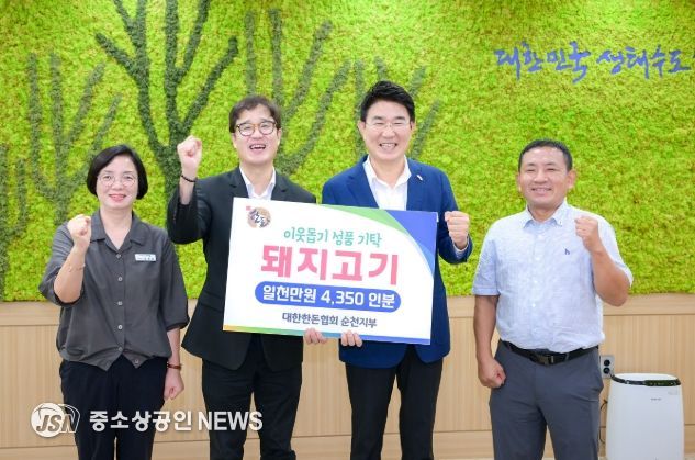 순천시는 25일 순천시청에서 (사)대한한돈협회 순천지부(지부장 김선일)와 일천만원 상당의 돼지고기 435박스(870kg) 전달식을 가졌다고 밝혔다.