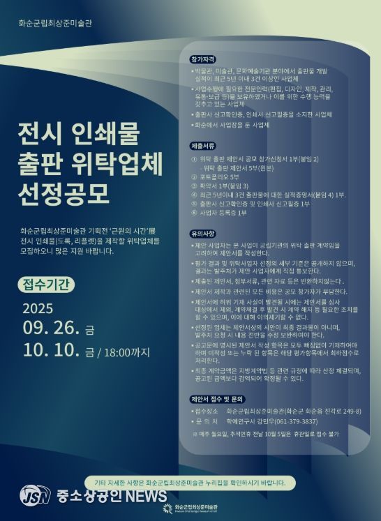 화순군은 29일 화순군립최상준미술관 기획전 ‘근원의 시간’ 展의 전시 인쇄물(도록, 리플렛) 제작을 전문적으로 수행할 위탁업체를 공개 모집한다고 밝혔다.