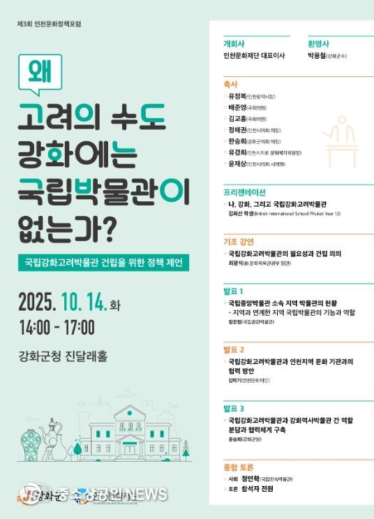 강화군은 오는 14일 강화군청에서 ‘고려의 수도 강화에는 국립박물관이 없는가?’를 주제로 정책 포럼을 개최한다고 밝혔다.