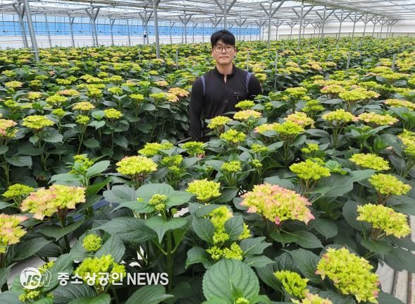 김승찬 대표는 한국농수산대학 화훼학과 출신의 청년 농업인으로, 2023년부터 현대식 스마트팜 하우스를 신축해 수국 재배를 본격화했다.