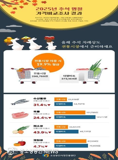 4인 기준 추석 차례상 준비 비용은 전통시장이 298,766원, 대형마트 373,164원으로, 전통시장이 대형마트에 비해 74,398원(19.9%) 저렴하며, 전체 27개 조사 품목 중 20개 품목이 전통시장에서 더 저렴한 것으로 조사됐다.