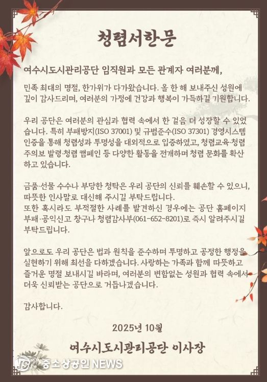 여수시도시관리공단은 민족 최대 명절인 추석을 앞두고 임직원과 관계자에게 청렴 서한문을 발송했다고 2일 밝혔다.