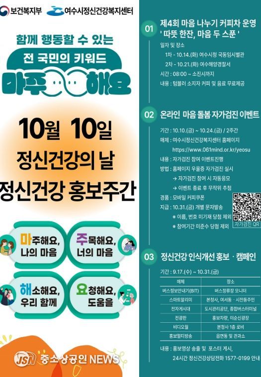 여수시는 정신건강의 날(10월 10일)을 기념해 10월 10일부터 24일까지 ‘2025년 정신건강 홍보주간’을 운영한다.