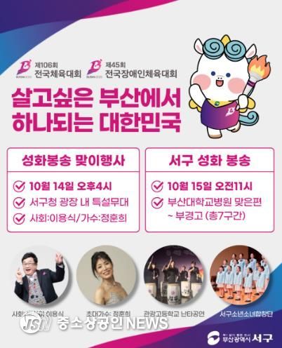 부산 서구는 오는 10월 14일 16시, 제106회 전국체육대회와 제45회 전국장애인체육대회의 시작을 알리는 “성화의 불꽃, 하나되는 서구”를 주제로 성화봉송 맞이행사를 서구청 광장 특설무대에서 개최한다고 밝혔다.
