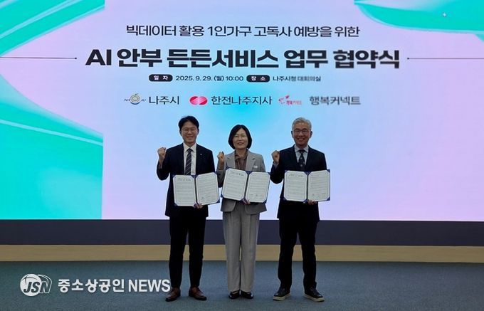나주시(시장 윤병태)는 최근 한국전력공사 나주지사, SK재단법인 행복커넥트와 함께 1인 가구 사회안전망 강화를 위한 ‘AI안부 든든서비스’ 3자 업무협약을 체결하며 민관공이 함께하는 통합형 사회안전망 구축에 나섰다고 11일 밝혔다.