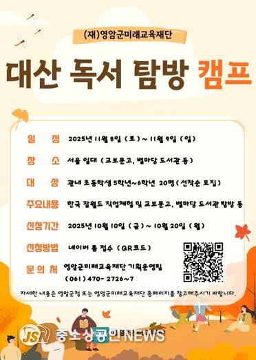 (재)영암군미래교육재단이 지역 독서 문화 증진과 아동 진로 탐색 기회 제공을 취지로 한 ‘2025년 대산 독서 탐방 캠프’ 참가자를 10일부터 20일까지 모집한다.