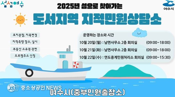 여수시는 오는 10월 20일부터 22일까지 도서지역 주민들의 지적·부동산·도로명주소 관련 민원을 현장에서 직접 상담·처리하는 ‘찾아가는 지적민원상담소’를 운영한다고 밝혔다.