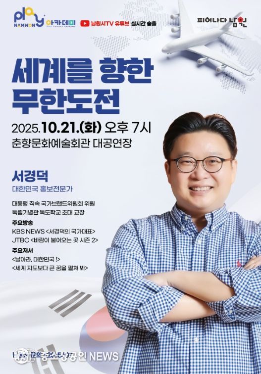 남원시는 오는 21일 오후 7시, 춘향문화예술회관 대공연장에서 대한민국 홍보 전문가 서경덕 교수를 초청해 “세계를 향한 무한도전”이라는 주제로 플레이(Play) 남원 아카데미를 개최한다.