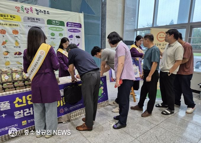 참가자들은 설문판에 스티커를 붙이며 ‘어제 저녁 몇 가지 컬러푸드를 먹었는지’를 직접 확인하는 참여형 활동을 진행했으며, 통밀 샌드위치와 생과일주스를 선착순으로 제공하는 컬러푸드 나눔 행사도 함께 열렸다.