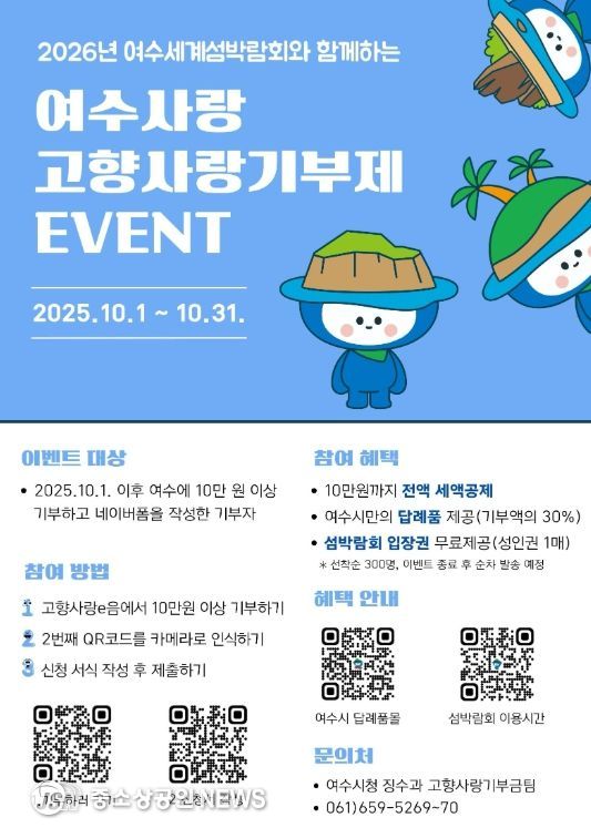 시 관계자는 “고향사랑기부제는 기부금 세액공제와 답례품 제공 등 다양한 혜택을 누릴 수 있는 1석 3조의 제도인데 이번 이벤트로 여수에 기부하면 ‘1석 4조’의 효과를 얻을 수 있다”며 “많은 분들이 고향사랑기부에 함께해주시고 2026여수세계섬박람회에도 큰 관심과 응원을 보내주시길 바란다”고 말했다.