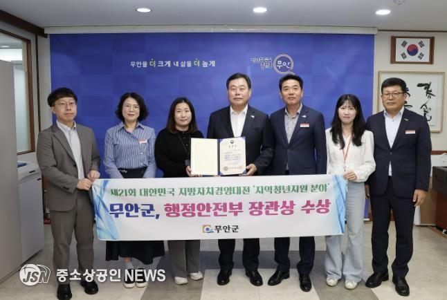 전남 무안군은 행정안전부와 한국일보가 공동으로 주최한 '제21회 대한민국 지방자치경영대전'에서 지역청년 지원 분야 우수기관으로 선정되어 행정안전부 장관 표창을 수상했다.