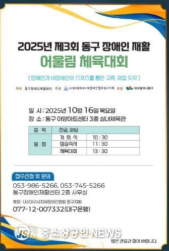 대구 동구청은 오는 16일, 아양아트센터에서 동구장애인 재활센터 주최로 ‘제3회 동구 장애인 재활 어울림 체육대회’를 개최한다.