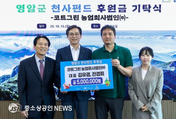 코트그린농업회사법인(주)(대표 김유겸·전성희)가 13일 영암군청에 천사펀드 500만원, 고향사랑기부금 200만원을 각각 전달했다.