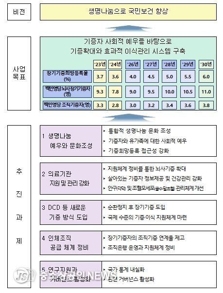 구체적으로 ‘생명나눔으로 국민보건 향상’이라는 비전하에, ①생명나눔 예우와 문화조성, ②의료기관 지원 및 관리 강화, ③순환정지 후 장기기증 등 새로운 기증방식 도입, ④인체조직 공급체계 정비, ⑤연구지원과 거버넌스 활성화 등 5개 대과제, 12개 세부과제를 추진한다.