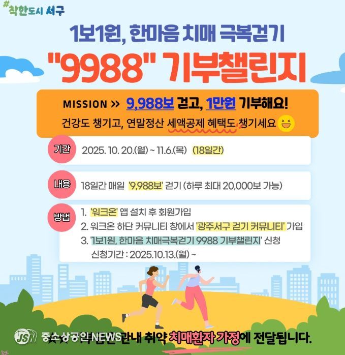광주광역시 서구가 오는 20일부터 11월 6일까지 18일간, 치매 인식 개선과 기부문화 확산을 위한 ‘1보1원, 한마음 치매극복걷기 9988 기부챌린지’를 진행한다.