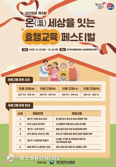 대구시교육청은 학생들이 웃어른을 공경하고 존중하는 마음을 기르며, 세대 간 소통과 화합을 이루기 위해 ‘온(溫)세상을 잇는 효행교육 페스티벌’을 개최한다고 밝혔다.