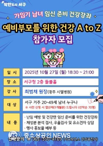 서구는 오는 27일 서구청 들불홀에서 난임치료 전문가를 초청해 ‘예비부모를 위한 건강 A to Z’ 건강강좌를 운영한다.