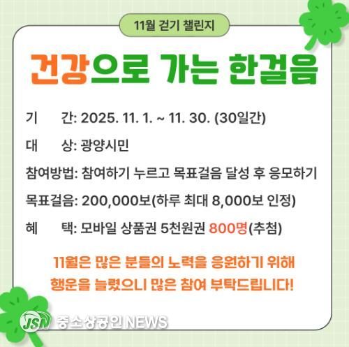 광양시는 지역 주민의 건강생활 실천을 돕기 위해 11월 1일부터 30일까지 모바일 걷기 앱 '워크온'에서 ‘건강으로 가는 한걸음 11월 걷기 챌린지’를 운영한다고 밝혔다.